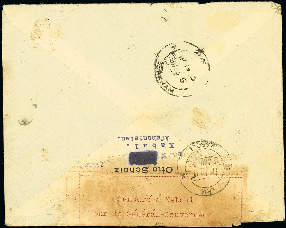 1934 (3 Jan.) envelope from Kabul to Germany (addressee's name excised) franked 1932 25p., 50p. and India Air 4a., on reverse mineographed "Censuré á Kaboul/par le Générál-Gouverneur" label, some faults but extremely rare. Photo