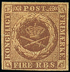 1851-54 Ferslew printing 4R.B.S. chocolate-brown, large part original gum, close to large margins all round, horizontal crease, otherwise fine and scarce. E. Paaskesen certificate (1988). S.G. 2, £900. Photo