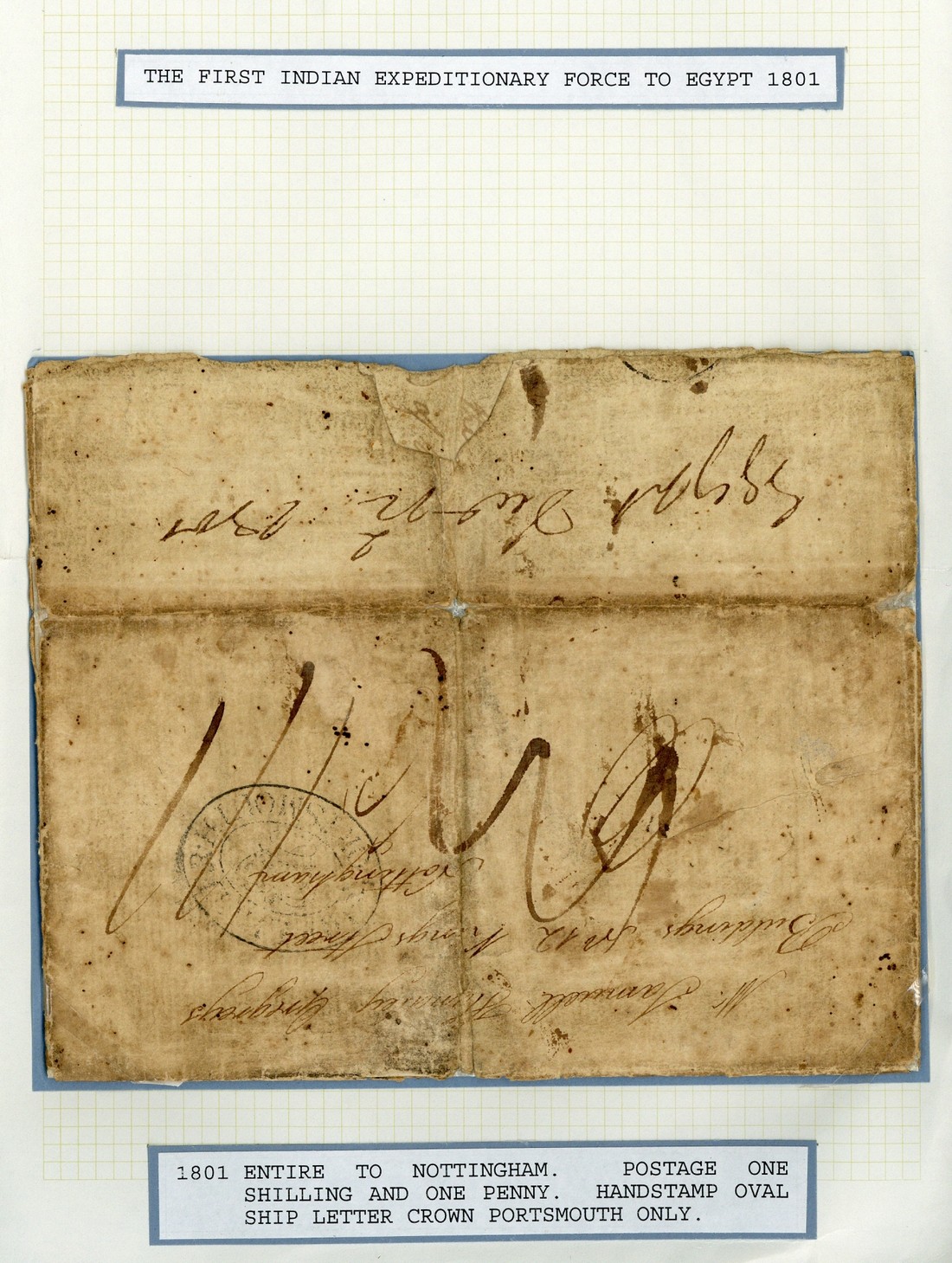1810 (14 Dec.) entire letter to Nottingham, datelined "Gizeh 4 Miles west of Grand Cairo)" and showing oval-framed "ship letter/(crown)/portsmouth", rated 1/1 in manuscript; stained and faults though a rare and important entire letter from the first Indian Expeditionary Force to Egypt. Photo