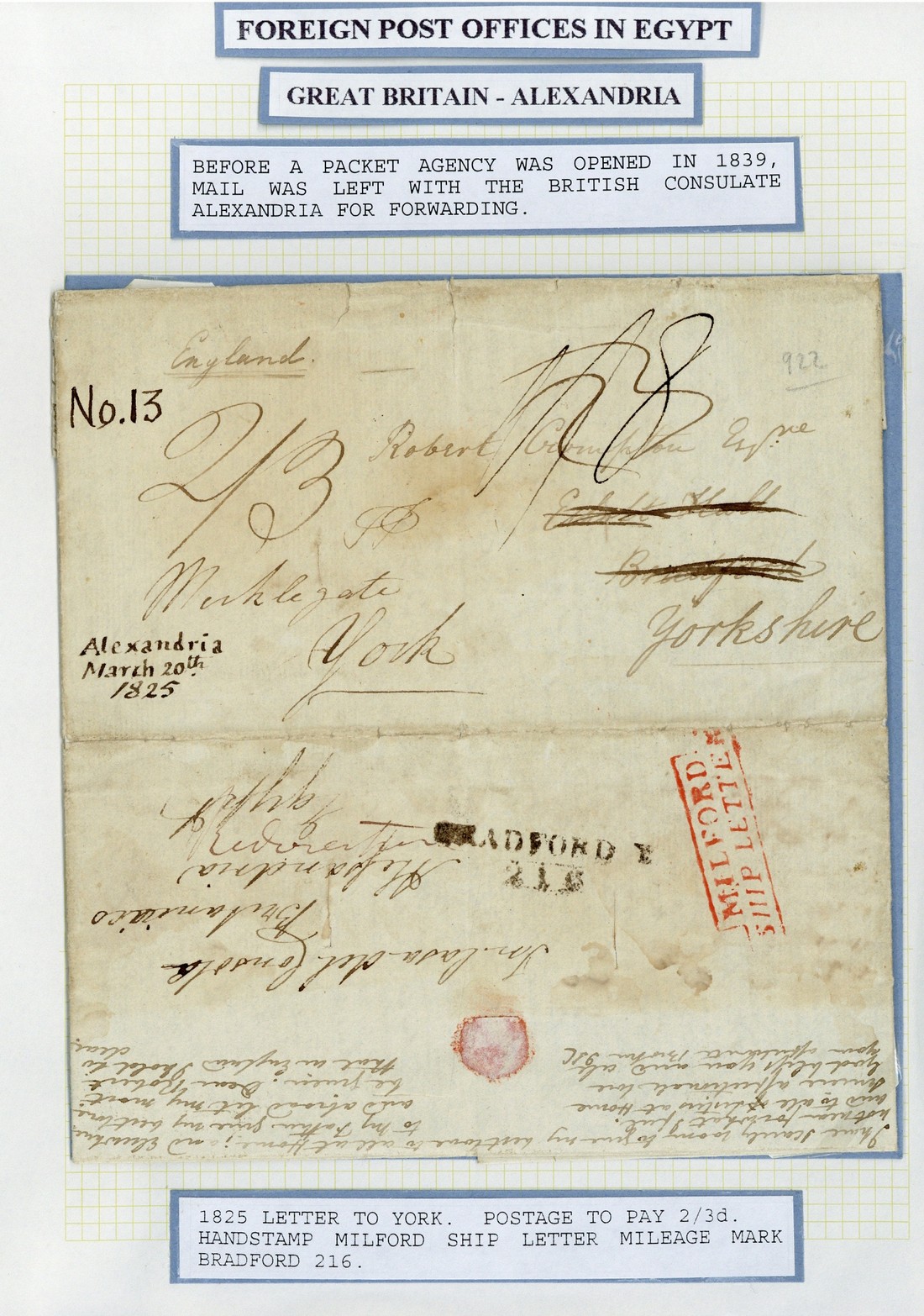 1825 (20 Mar.) entire letter from Alexandria to Bradford, rated "1/8", (deleted) and replaced by "2/3", on reverse red step-type "milford/ship letter" and with "bradford y" mileage marking, re-addressed to York; disinfection slits and some staining, manuscript notes on the front. Scarce