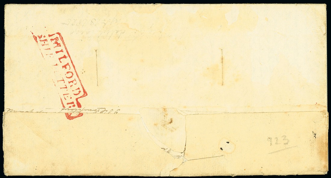 1825 (25 Apr.) entire letter to Bradford, datelined "Cairo, British Consulate", rated "3/2" and slit for disinfection with the usual staining, the reverse with fine step-type "milford/ship letter" in red, fine. Photo