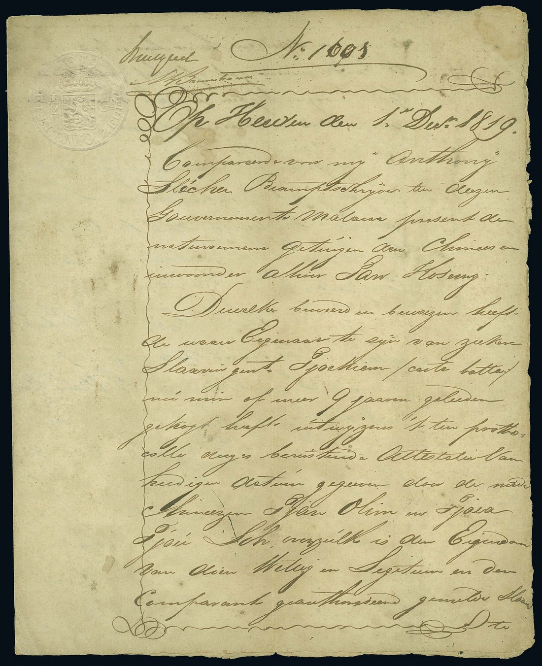 1819 (1 Dec.) document written in Dutch being a declaration by a Chinese man to be the owner of a woman slave for the last nine years, showing a good to fine impression of ½ Guilder embossed stamp, a little aged though fine. Photo