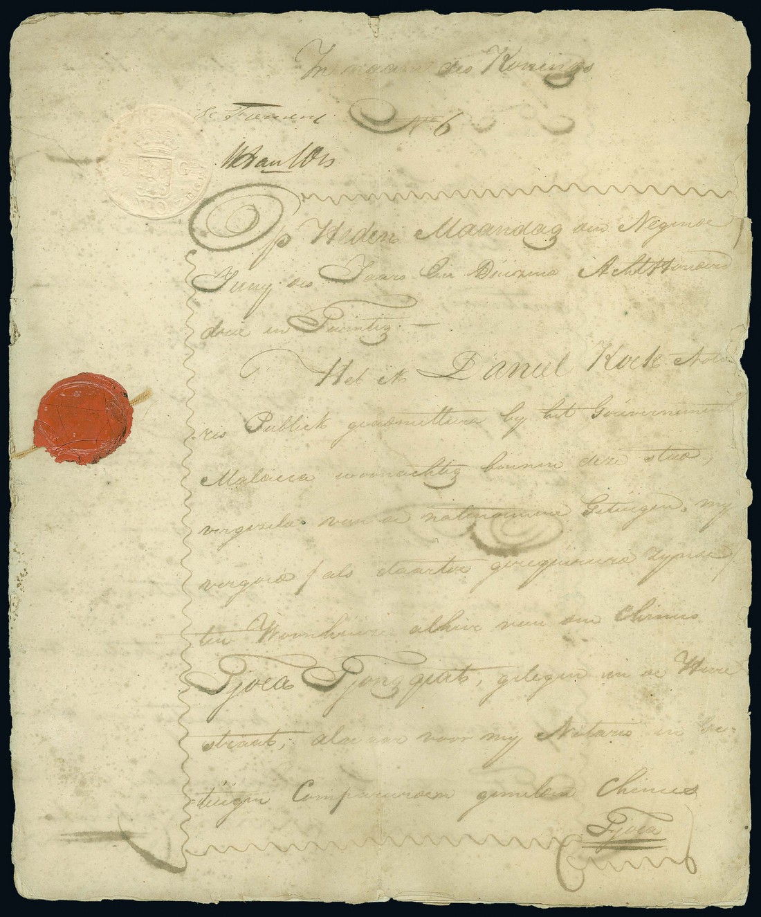 1822 eight page document written in Dutch being the Will of a Chinese, showing good to fine strike of ½ Guilder embossed stamp; a little aged though fine. Photo