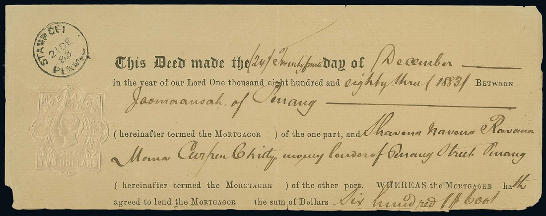1883 (21/24 Dec.) loan agreement showing good to fine $2 albino embossed handstamp with "stamp office/penang" datestamp alongside; a little fragile along folds. Scarce. Photo