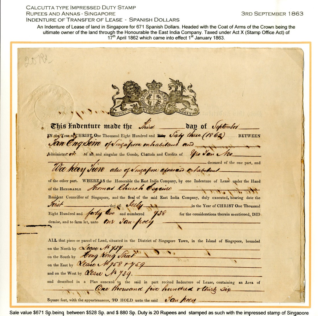 1863 (3 Sept.) Indenture of Lease of land in Singapore for 671 Spanish Dollars, showing good to fine 20 Rupees Calcutta type embossed handstamp, fine