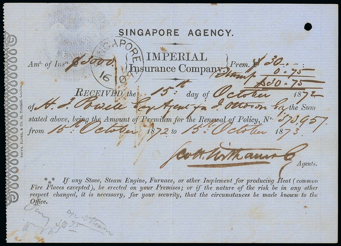 1872 (16 Oct.) Premium receipt showing fine 75c. Calcutta type embossed handstamp partly overstruck by "singapore" datestamp, fine. This is a new discovery and not previously recorded by either Hsiong or Podger. Photo