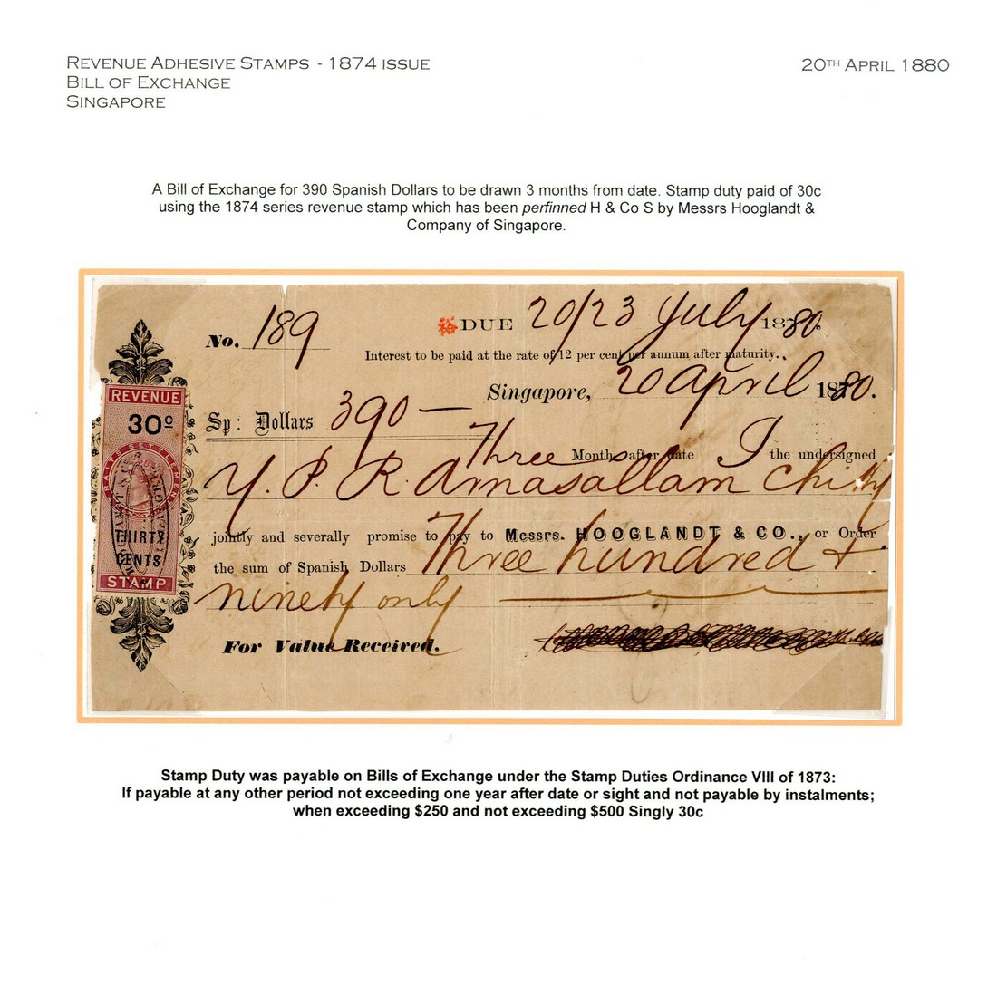 1880 (20 Apr.) Bill of Exchange (a little creased) for 390 Spanish Dollars to be drawn three months from date, bearing 1874 30c. perfined "h&co.s" and cancelled by firm's chop; and 1882 (5 June) Receipt of bankrupt funds bearing 1882 3c. cancelled in manuscript. An interesting pair