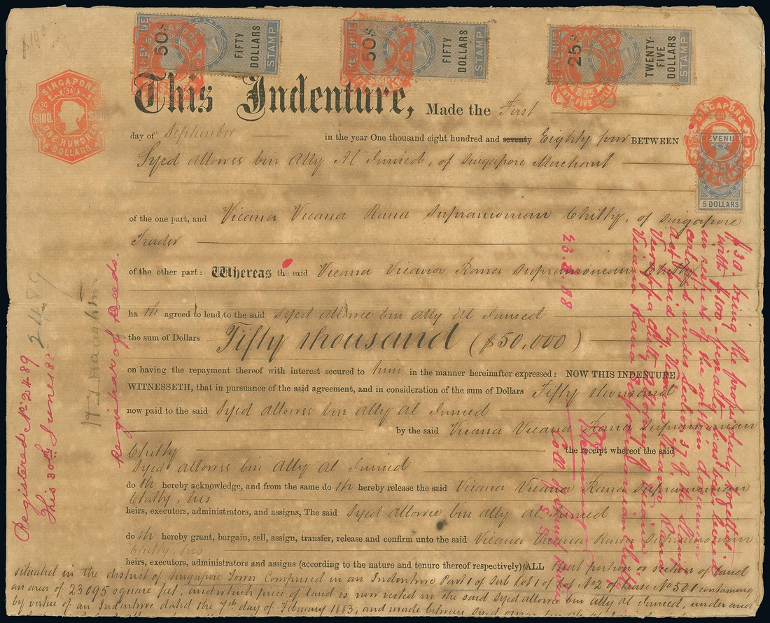 1884 (30 Aug.) Indenture entered into for the loan of $50,000 against property on which duty was paid, showing fine $100 red embossed datestamp. The document was then endorsed in red ink on 23 March 1888 with regard to late payment of duty against settlement of parts of the mortgage at earlier dates which are recorded within. The penalty was paid with 1874 $25 and $50 (2) and 1888 $5, all tied by red embossed datestamps; the document with some discolouration and other lesser faults. A most unusual and interesting document illustrating, over a short four year period, the two separate types of revenue collection by impressed datestamp alone and latterly by adhesive stamp cancelled by impressed datestamp. Photo