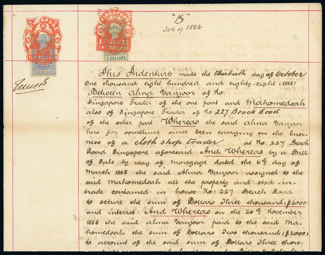 1888 (30 Oct.) Indenture of mortgage for the transfer of $2000 being the remainder of a mortgage on Singapore property, bearing 1882 $10 and 1888 $2, both tied by red embossed datestamp, fine. The $10 a scarce stamp on document, only 13 sheets of 168 stamps were invoiced in 1882 and 1883. Photo