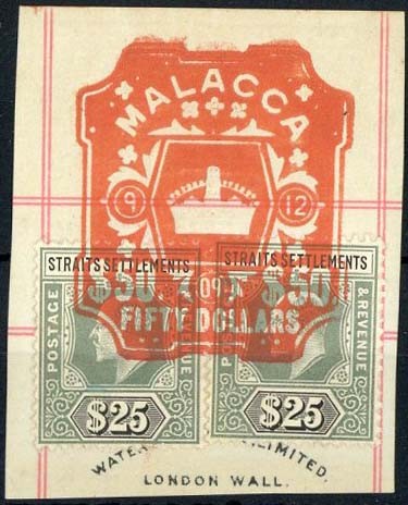 1906 MCA $25 grey-green and black (2) on piece cancelled by complete Malacca red embossed datestamp, fine. A scarce usage in Malacca