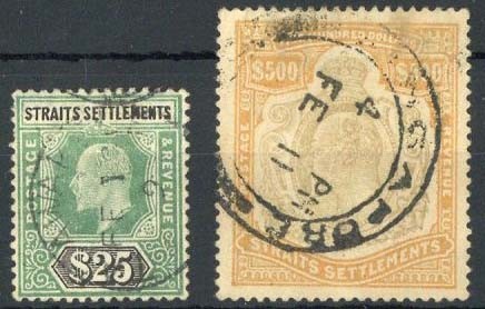 1906 MCA $25 grey-green and black forgery with Ceylon 1899 Talawakele c.d.s. (pink B.P.A. Certificate, 2008) and 1910 $500 purple and orange forgery with fake Singapore datestampF