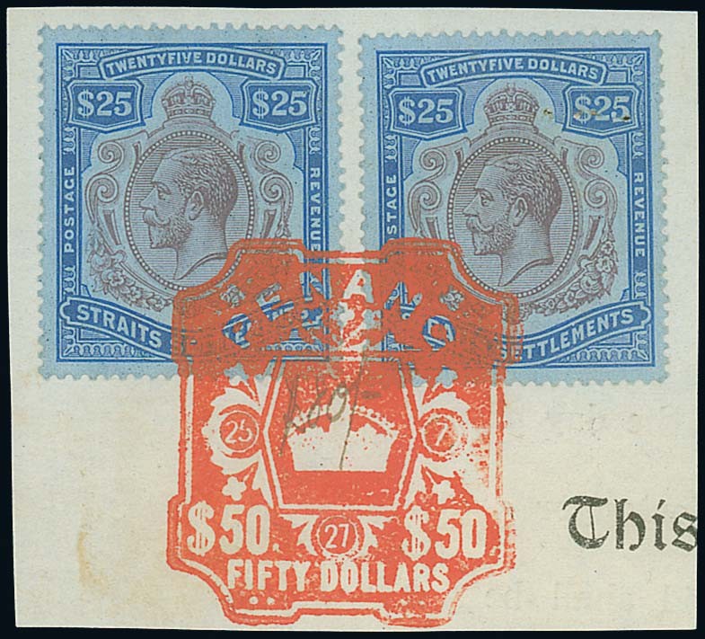 — $25 purple and blue on blue (2, one clearly showing broken Crown and scroll), both affixed to piece tied by Penang red embossed datestamp (25.7.27), fine. Photo
