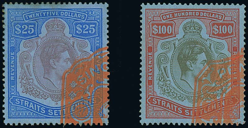 1938 "revenue/revenue" $25 purple and blue on blue (slightly soiled at top) and $100 black and carmine on blue, both cancelled by part red embossed datestamp, fine. Barefoot 58-59, £225. Photo