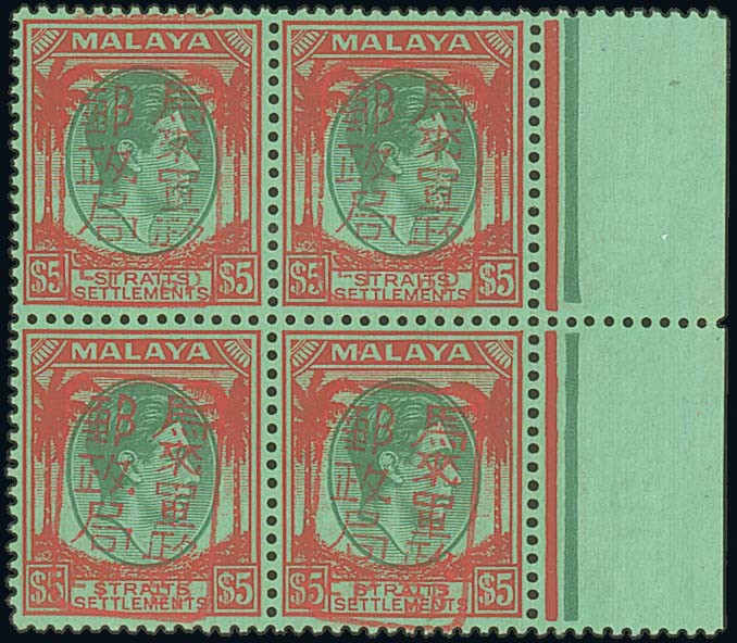 — Straits Settlements $5 green and red on emerald marginal block of four with single frame chop in red, fine mint. S.G. J160, £900. Photo