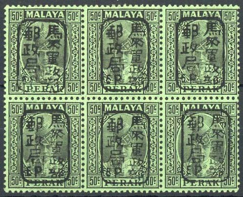 Perak 50c. black on emerald with single frame chop in black on Perak emerald block of six (3x2), fine unmounted mint. S.G. J202, £300