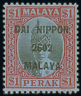 1942 (May) "dai nippon/2602/malaya" on Perak $1 black and red on blue, fine mint. S.G. J252, £600. Photo