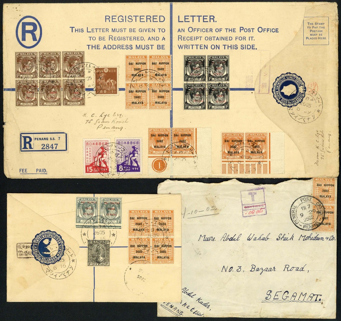 1945 (May-June) Straits 15c. registered envelope (size K) with Ochiburi seal, and Selangor 15c. registered envelope with single frame chop in black, both addressed locally at Penang and bear additional adhesives tied by Japanese type c.d.s. and show Penang 7 registration label; also 1942 (29 Sept.) envelope (battered) from Penang to Segamat, bearing Negri Sembilan "dai nippon" 2c. vertical pair tied by Type JD7 and with a fine strike of framed "t/centimes" h.s. (Type UP9; earliest recorded date) in violet