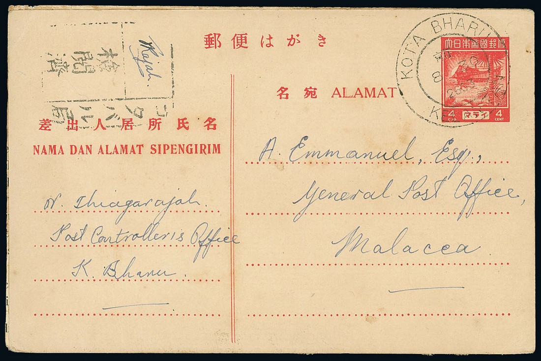 1943 (30 Aug.) 4c. stationery card to Malacca, cancelled by "kota bharu/kelantan" double-ring d.s. (Type D10) and showing censor chop signed by the postmaster. Photo