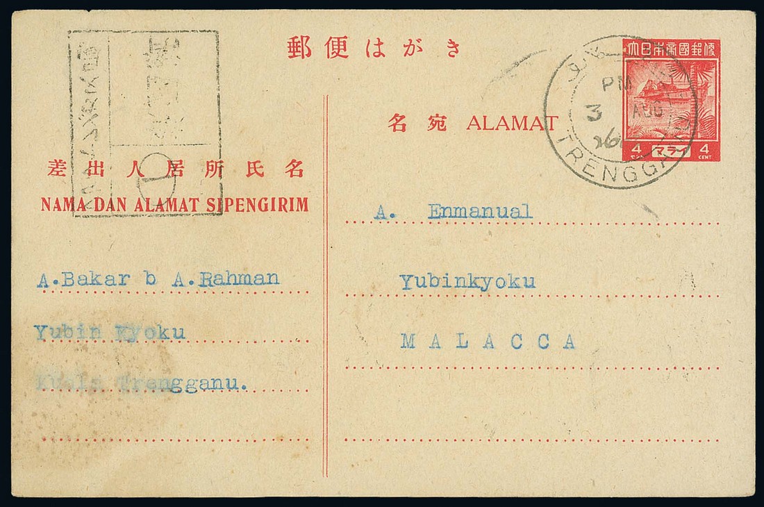 1943 (3 Aug.) 4c. stationery card to Malacca, cancelled by bi-lingual "trengganu" double-ring d.s. (Type D4) with year date in manuscript at showing censor chop at upper left. Photo