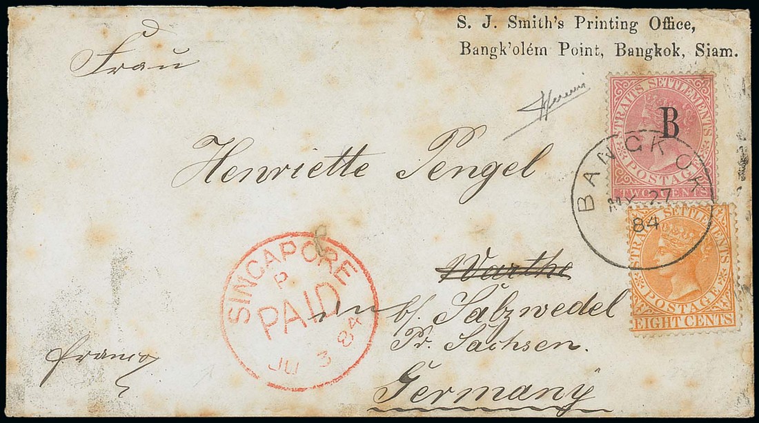 1884 (27 May) envelope to Germany with printed "S.J. Smith's Printing Office,/Bangk'olém Point, Bangkok, Siam" at upper right, bearing 1883 CA 2c. pale rose in combination with Straits Settlements 1882 8c. orange, both neatly tied by fine "bangkok" c.d.s., showing red Singapore c.d.s. (3.6) with arrival datestamp (6.7) on reverse; the envelope with some age spotting. An extremely rare mixed franking with only two others are recorded. Photo