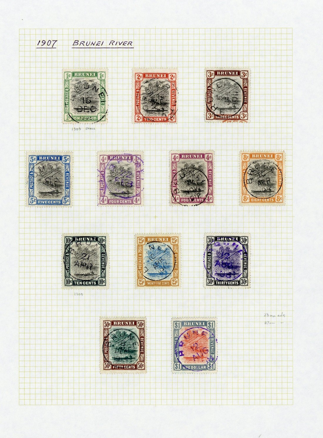 1c. to $1 with both 4c. shades, each centrally cancelled by Brunei c.d.s. (in violet on one 4c., 30c. and $1), fine. S.G. 23-33, £340