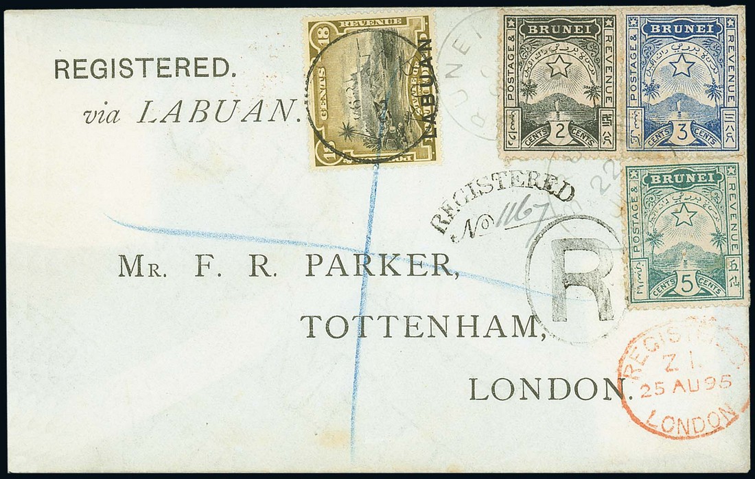 1895 (22 July) "Parker" envelope registered to London, bearing 1895 2c., 3c. and 5c. cancelled by Brunei c.d.s. on day of issue, in combination with Labuan 1894 Pictorial 18c. cancelled by Labuan c.d.s. on 25 July, showing various registration markings with arrival d.s. on reverse, fine. Photo