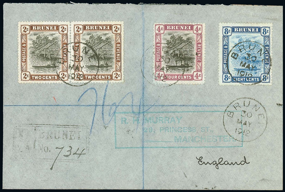 1912 (30 May) envelope registered to Manchester, bearing 191907-10 4c. grey-black and reddish purple and 1908-22 2c. pair and 8c., each neatly cancelled by Brunei c.d.s., showing registration h.s. and, on reverse, Labuan (31.5) and arrival (6.7) datestamps. Attractive. Photo