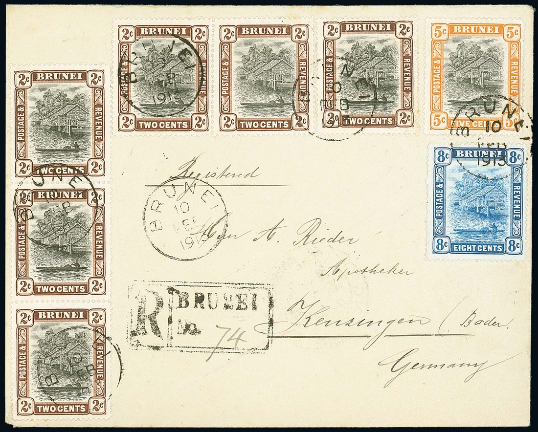 1913 (10 Feb.) "Rieder" envelope registered to Germany, bearing 1908-22 2c. (6), 5c. and 8c., all tied by Brunei c.d.s., showing registration h.s. and, on reverse, Labuan (12.2) and Singapore (17.2) transit datestamps. Photo