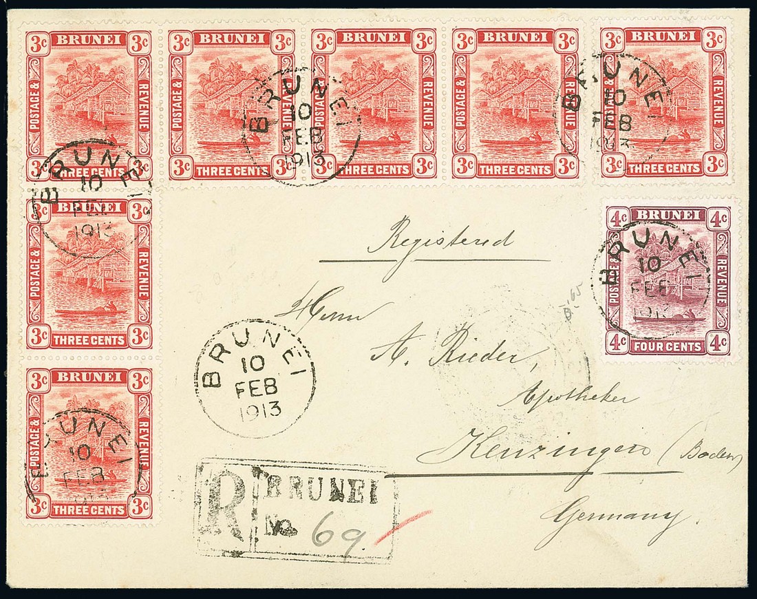1913 (10 Feb.) "Rieder" envelope registered to Germany, bearing 1908 3c. (7) and 4c., all tied by Brunei c.d.s., showing registration h.s. and, on reverse, Labuan (12.2) and Singapore (17.2) transit datestamps. Photo