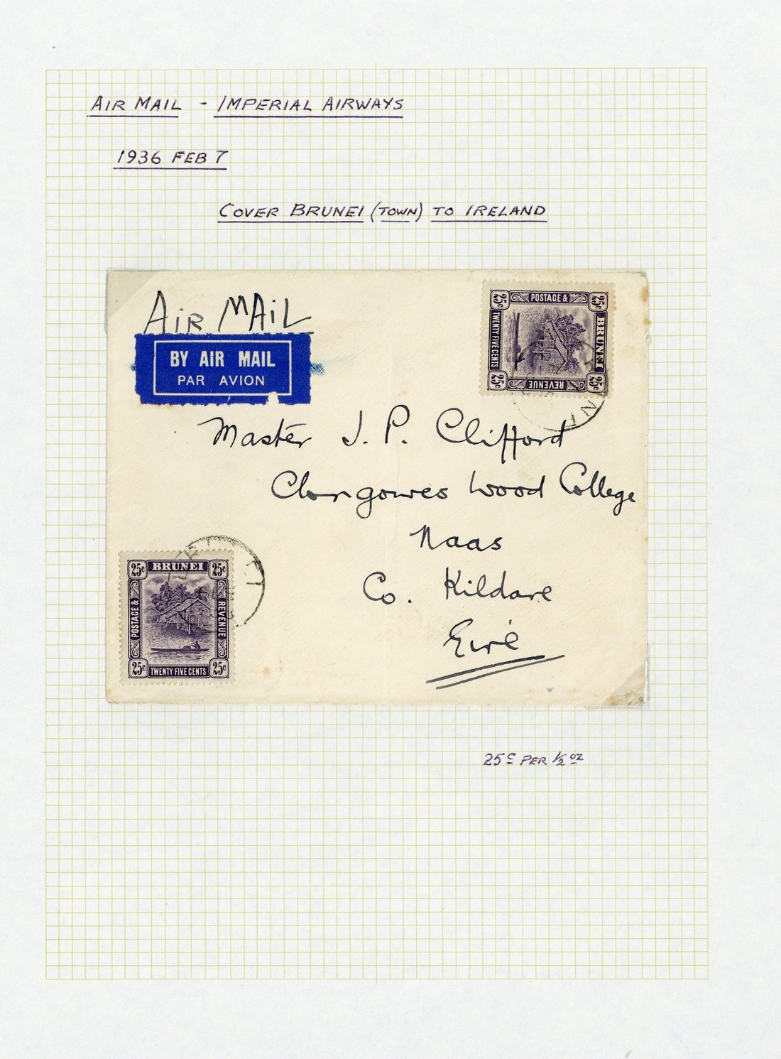 1936 (7 Feb.) double rate envelope to Ireland, flown by Imperial Airways, bearing 1931 25c. (2) tied by Brunei c.d.s.; and 1937 (13 Jan.) envelope registered to Germany, bearing 1924-37 4c. orange, 5c. chocolate, 6c. scarlet and 12c., all tied by Brunei c.d.s. and showing German Opened and Resealed labels applied at Hannover