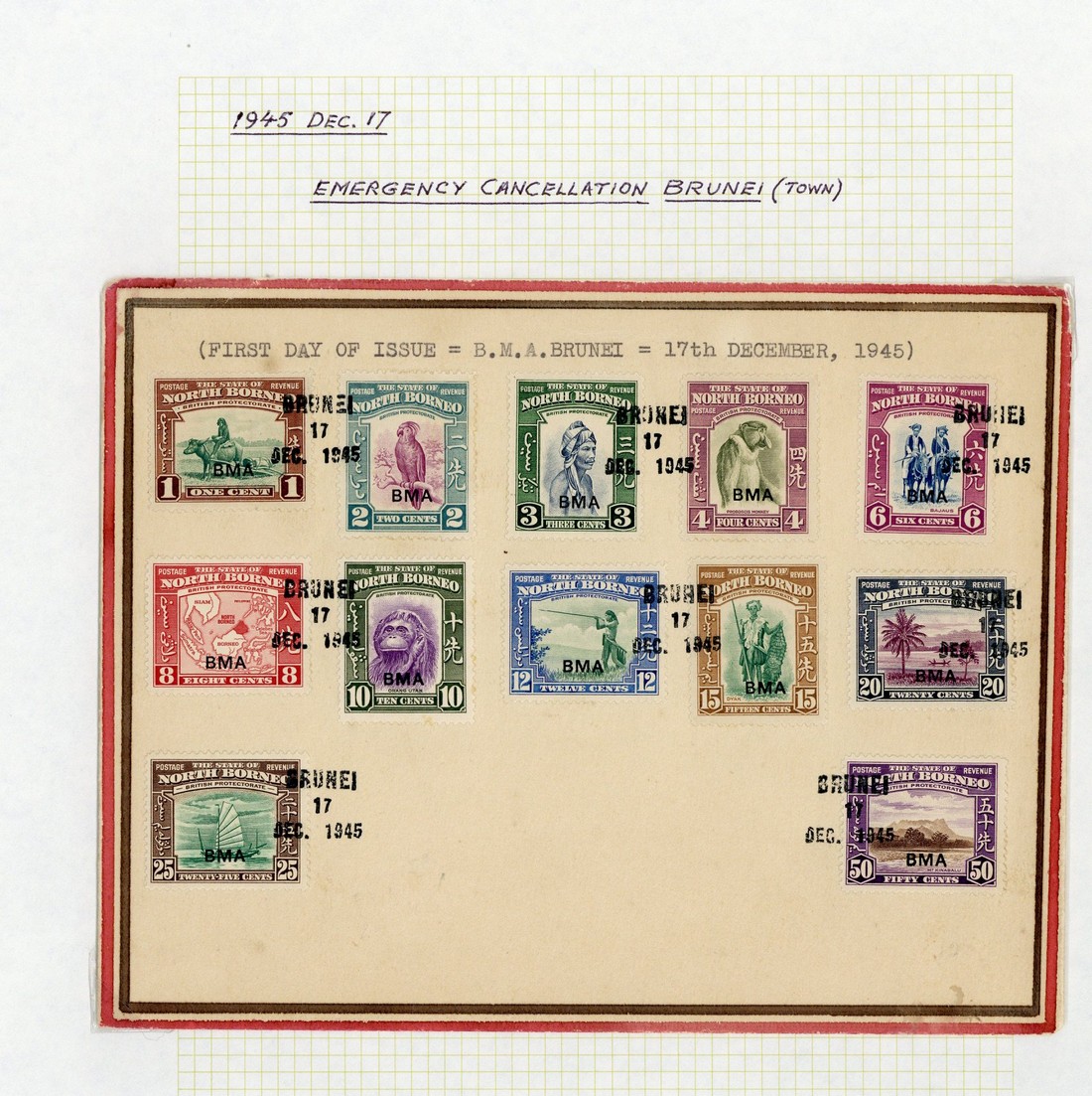 1945-46 envelopes (6) including 1945 (17 Dec.) unaddressed envelope bearing North Borneo BMA 1c. to 50c. and a locally addressed envelope bearing Sarawak BMA 1c. to 50c., each tied by Brunei "Straits Times" d.s. on day of issue, 1946 (24 July) envelope from Kuala Belait to UK bearing North Borneo BMA 10c. and Sarawak BMA 15c. (3), 1946 (11 Oct.) envelope from Kuala Belait to Labuan bearing North Borneo BMA 15c., 1946 (14 Oct.) envelope (light stains) from Kuala Belait to Brisbane bearing North Borneo BMA 8c. (5) and Sarawak BMA 15c., and 1946 (6 Dec.) envelope from Kuala Belait to Labuan bearing North Borneo BMA 2c. and 6c. Mostly fine