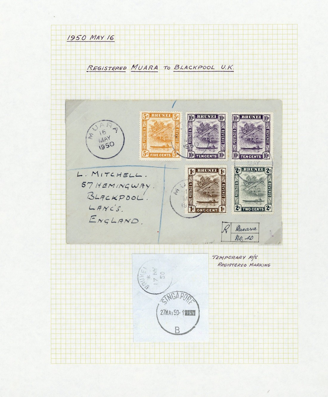 1947 (Sept.) envelope from Kuala Belait to Singapore franked at 40c., 1947 (3 Dec.) envelope from Brunei to UK franked at 57c., 1950 (16 May) envelope registered from Muara to UK franked at 28c. and showing manuscript registration marking, 1950 (11 Sept.) envelope from Temburong to Limbang franked at 8c., 1951 (17 July) envelope registered from Kuala Belait to Melbourne franked at 50c., 1952 (21 Feb.) envelope registered from Muara to UK franked at 70c. and 1952 (May) envelope from Seria to UK franked at 55c. A clean lot