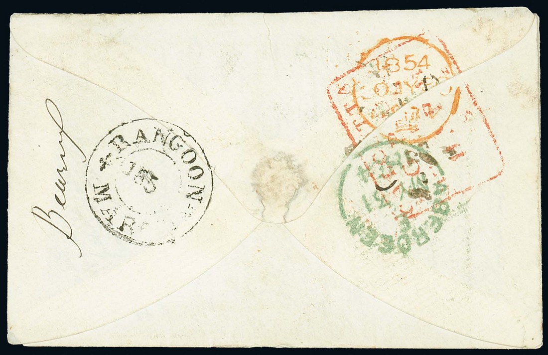 1854 (1 Apr.) envelope (with letter) ex the "Gibbon" correspondence to Aberdeen, rated "1/10", showing framed "india" in red and, on reverse, fine "rangoon/mar" double-ring d.s. (Type PS11) with Calcutta and London transit d.s.; the face panel with recipient's notation across top. Photo