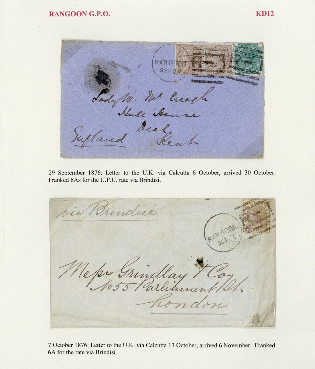1876 (29 Sept.) envelope to Deal bearing 1a. pair and 4a., and 1876 (6 Oct.) envelope (creases) to London bearing 6a., all clearly tied by "R-I" duplex (Type KD12)