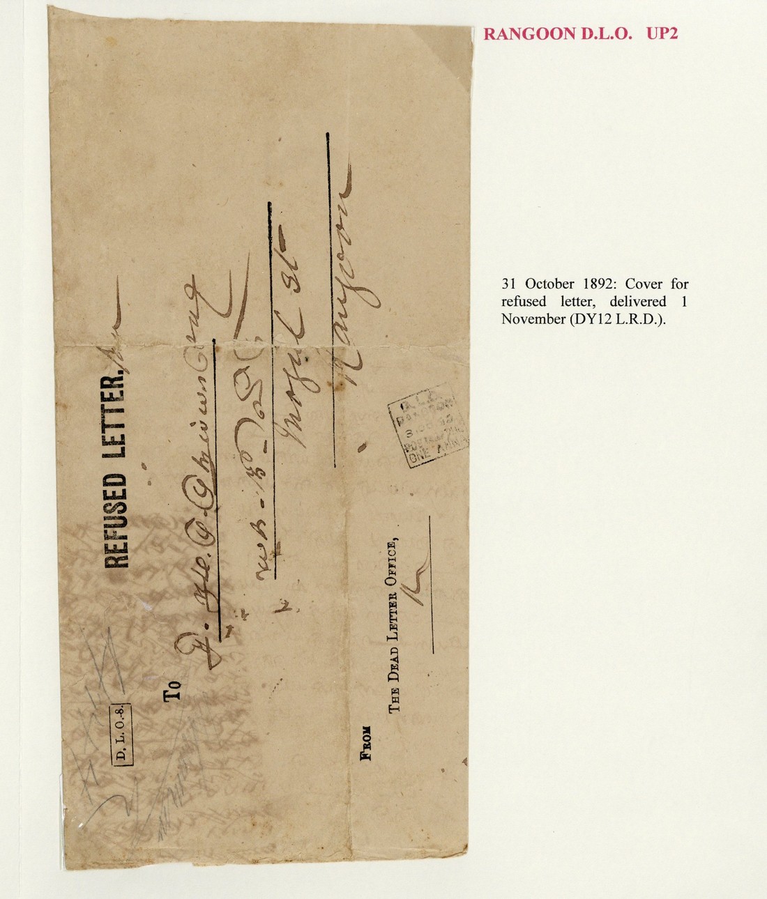 1892 (31 Oct.) "refused letter" envelope from the Dead Letter Office addressed locally, showing boxed "d.l.o./rangoon/postage due/one anna" d.s. for 3 November (Type UP2, the only recorded example); some creases/folds