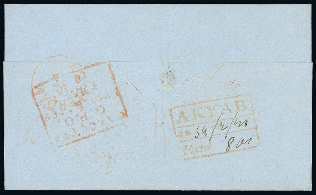 1854 (20 Feb.) entire to Amsterdam, marked "Pr Overland Mail Via Marseilles", rated "1/-", showing framed "india paid" and "indes or/marseilles" c.d.s. in red and, on reverse, fine "akyab/Paid" d.s. (Type PS5) in red with Calcutta transit d.s. alongside; the addressee's name partly inked-in. Photo