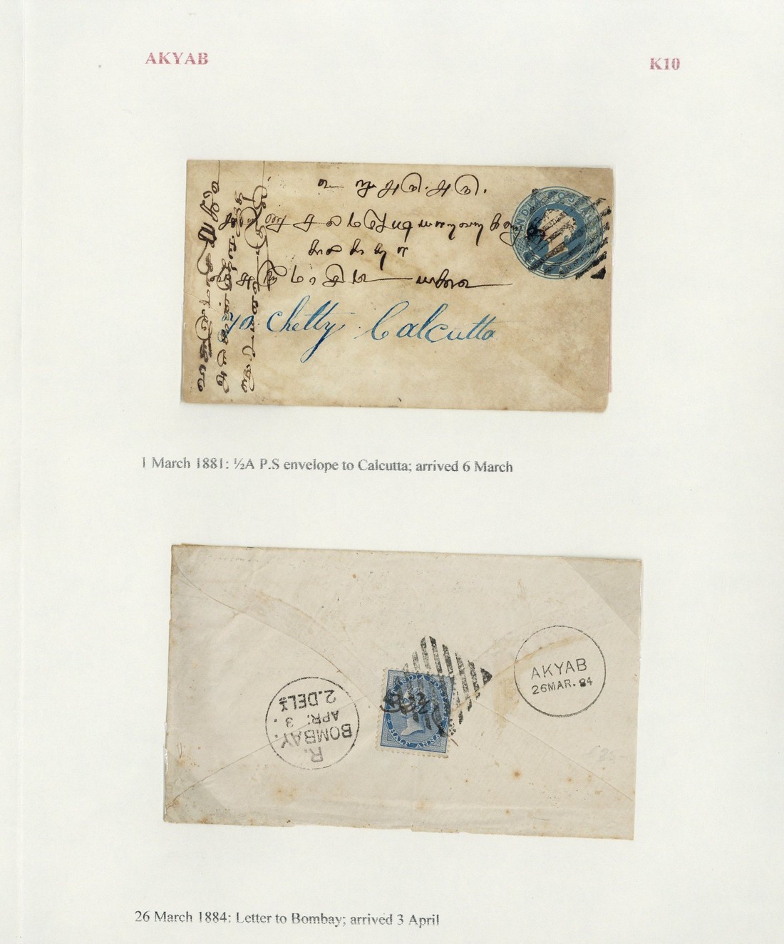 1856 unstamped envelope to Amsterdam (addressee's name partly inked-in) showing, on reverse, "akyab/p.o." double-ring d.s. (Type D1) in black; 1876 (29 Sept.) envelope to Paris, bearing 1a. and 4a. tied by "R-2" duplex (Type KD8); 1881 (1 Mar.) ½a. stationery envelope to Calcutta and 1884 (26 Mar.) envelope to Bombay bearing, on reverse, ½a., both cancelled by diamond of bars (Type K10) with the latter showing Akyab c.d.s. (Type D9) alongside