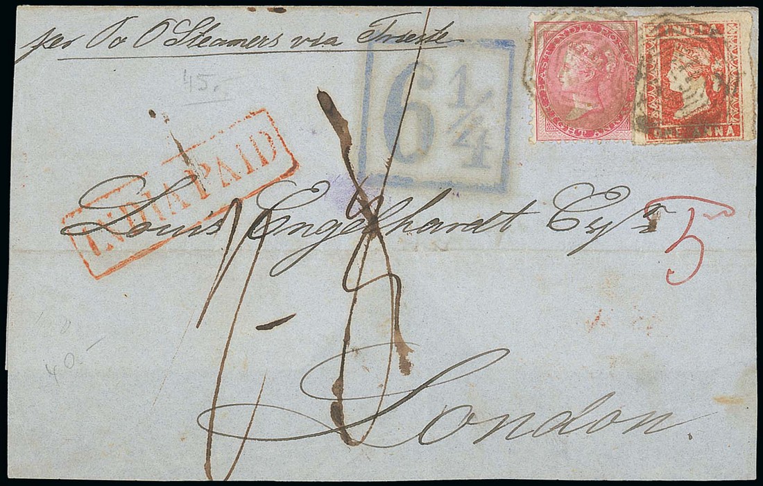 1857 (10 Feb.) front and part back to London, marked "per P&O Steamers via Trieste", rated "6" (deleted), "1/-" and "5d" in red, bearing 1854 1a. and DLR 8a., both cancelled "B/5", showing framed "india paid" in red, boxed "6¼" in blue and, on reverse, "akyab/p.o." double-ring d.s. and Calcutta transit c.d.s., both in red. Neat and attractive. A very rare mixed-issue franking. Photo
