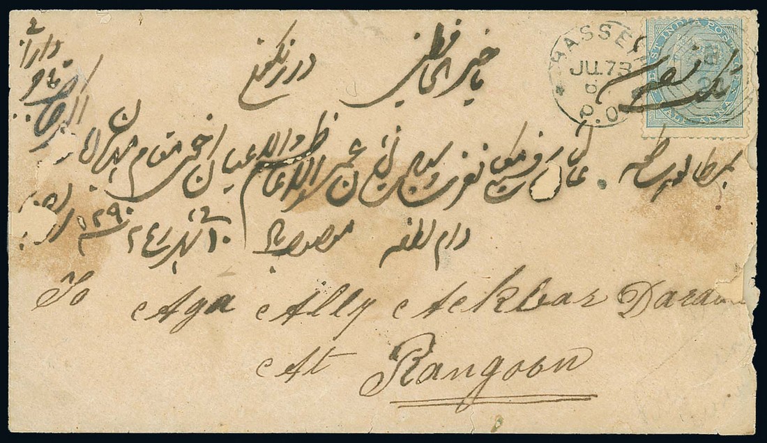 1873 (6 June envelope to Rangoon, bearing ½a. tied by fine "B/21" duplex (Type KD3) and showing "rangoon/delivery" oval d.s. on reverse. Photo