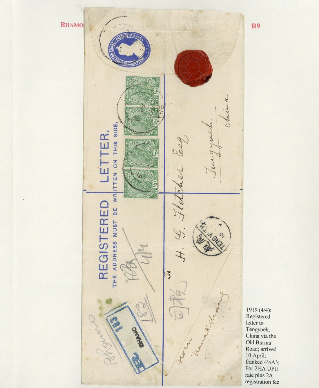 1917 (20 Mar.) KE 2a. stationery envelope uprated with 2a. pair and 1919 (28 Mar.) and (4 Apr.) KGV 2½a. registered envelope uprated 1a. and 2a. respectively, all addressed to Tengyueh, China and cancelled by R8 (only recorded date) and R9 datestamps