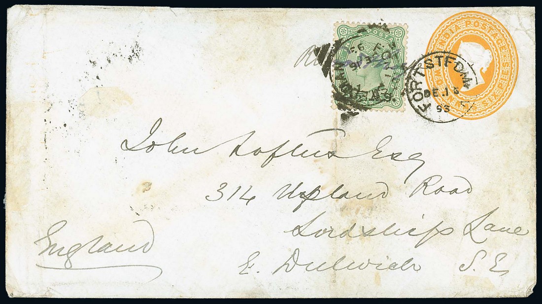 1893 (15 Dec.) 1a.6p. stationery envelope to London cancelled by "fort stedman" c.d.s. (Type D3), uprated with 2½a. on 1a.6p. cancelled by "fort stedman" squared-circle d.s. (Type KD2) and showing, on reverse, Rangoon, Bombay and arrival datestamps; the envelope a little stained and wrinkled. Photo