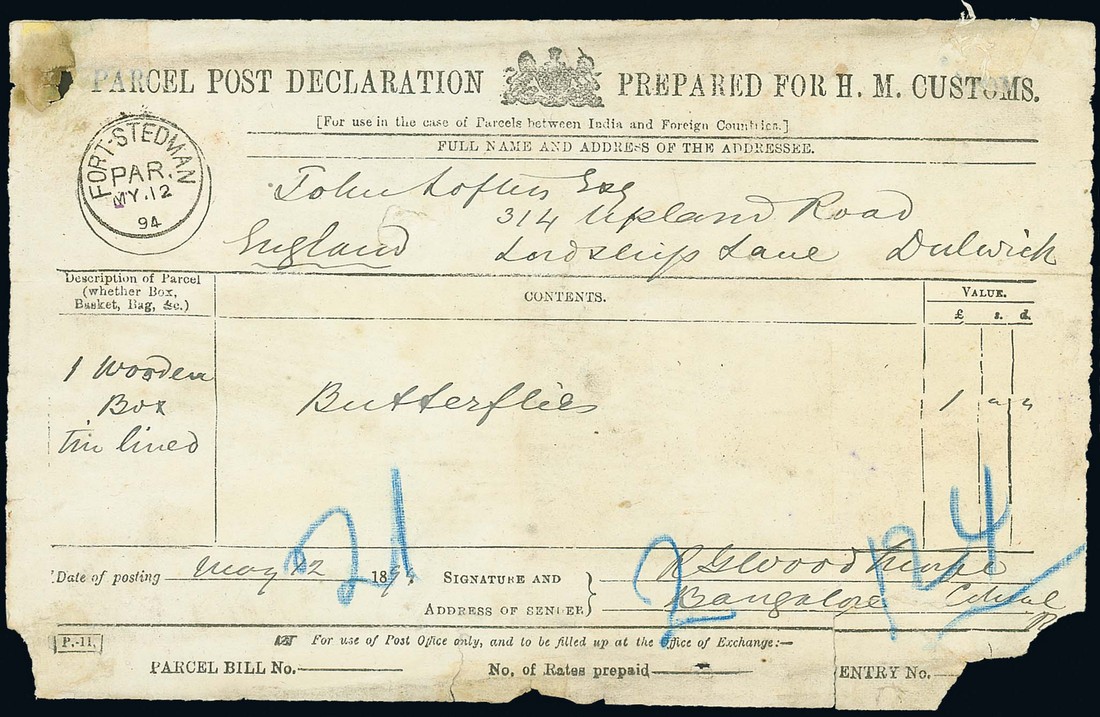 1894 (12 July) "parcel post declaration prepared for h.m. customs" form to Dulwich for a tin lined wooden box containing butterflies, showing "fort stedman/par" c.d.s. (Type PPI; the later of the two known); some faults. Photo