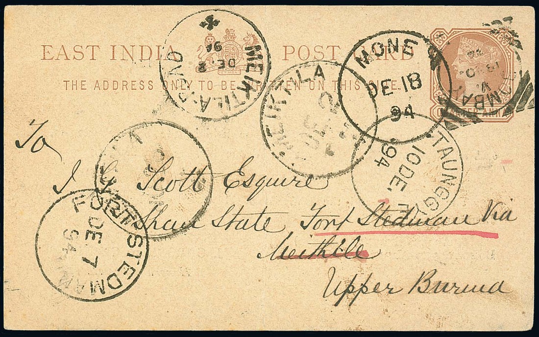 1894 (18 Nov.) ¼a. stationery card (central vertical crease) from Bombay to Meiktila showing Type D2 arrival c.d.s.(2.12; latest recorded date), re-addressed to Fort Stedman showing Meiktila Road Type D2 transit c.d.s. (2.12) and Fort Stedman arrival c.d.s. (Type D4, 7.12; earliest recorded date), then re-addressed again to Mone? showing Taungggye transit c.d.s. (Type D2, 10.12; earliest recorded date) and Mone arrival c.d.s. (Type D2, 18.12; only recorded example); also 19905 (15 Apr.) ½a. stationery envelope to Madras cancelled by Type D4 c.d.s. (latest recorded date). Photo for first