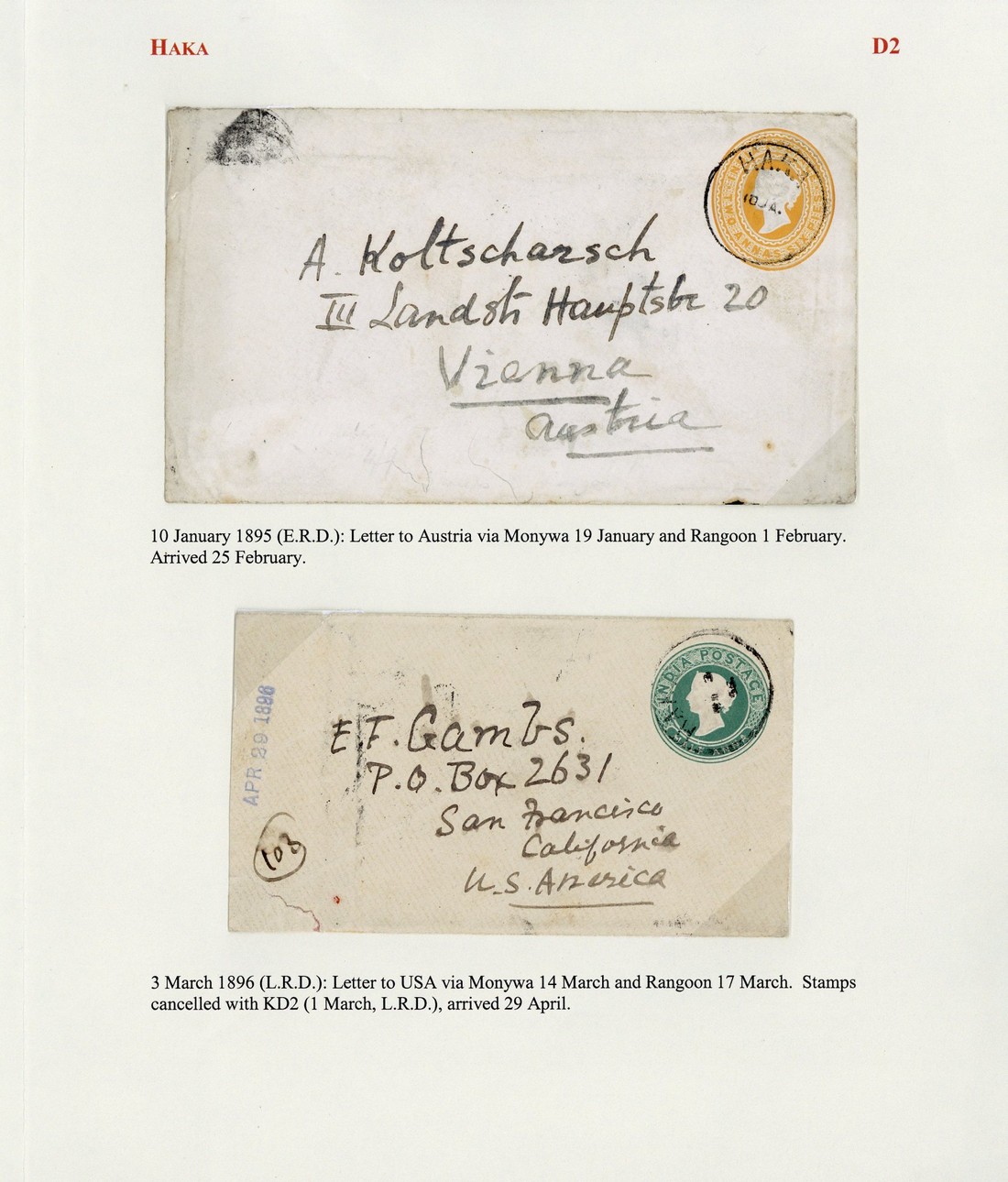 1895 (10 Jan.) 2a.6p. stationery envelope to Vienna clearly tied by "haka" c.d.s. (Type D2; earliest recorded date) and showing, on reverse, Monywa, Rangoon, Sea Post Office and arrival datestamps; 1896 (3 Mar.) ½a. stationery envelope to San Francisco, similarly cancelled and bearing on reverse 1a. pair tied by "haka" squared-circle d.s. (Type KD2 and Monywa transit d.s. A good pair of covers