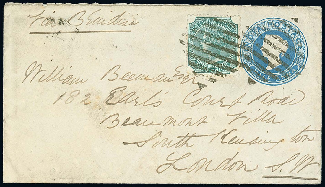 1880 (6 Oct.) ½a. stationery envelope to London uprated with 4a., both cancelled by diamond of bars (Type K5) and showing, on reverse, "henzada" (Type D5), Bombay and arrival datestamps; also 1882 ½a. stationery envelope front to Paris uprated with 1a. (2, one only a part as it was affixed over top edge of envelope, both cancelled by diamond of bars. Photo