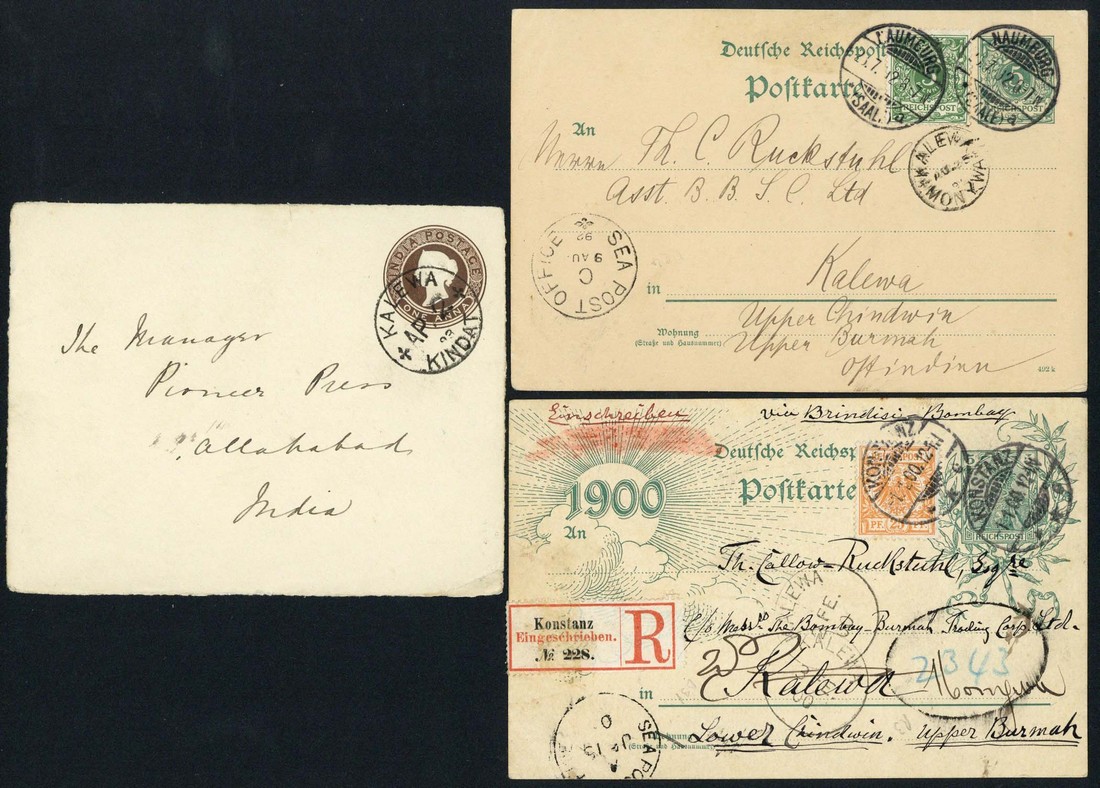 1892 (28 July) German 5pf. stationery card from Naumburg to Kalewa, uprated 5pf.) and showing "kalewa/monywa" c.d.s.; 1893 (2 Apr.) 1a. stationery envelope front to India cancelled by fine "kalewa/kindat" c.d.s. (Type D2; earliest recorded date); 1900 (1 Jan.) German 5pf. Millennium postcard from Konstanz to Kalewa, uprated 25pf. and cancelled on day of issue, showing "kalewa" arrival datestamp. A fine trio