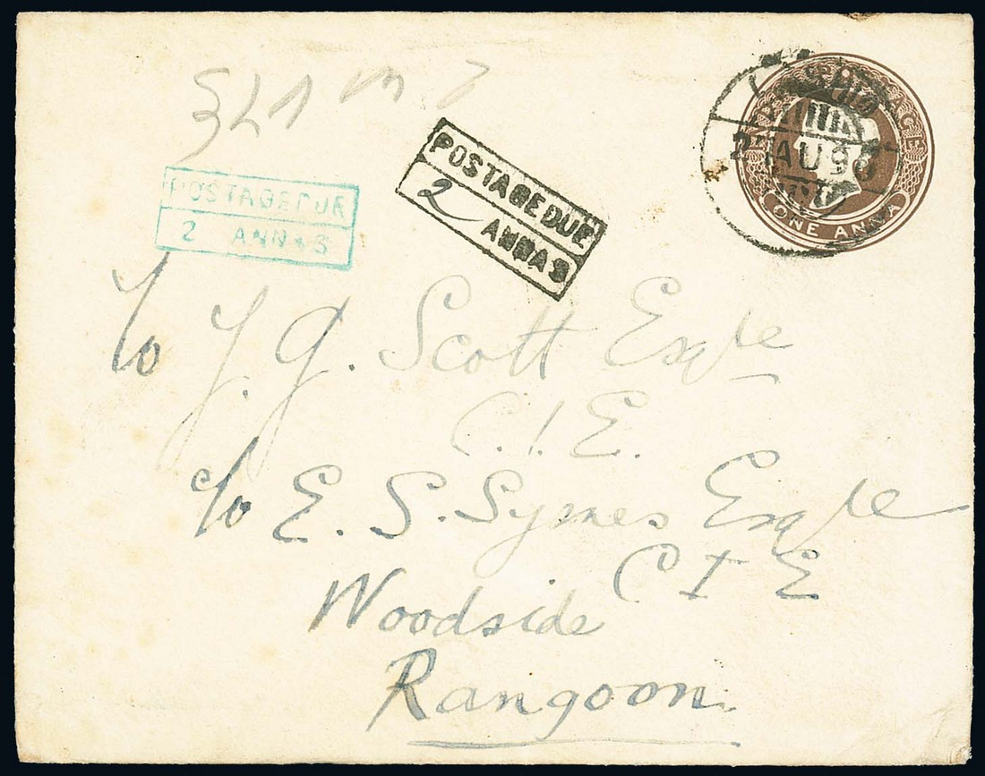 1896 (27 Aug.) underpaid 1a. stationery envelope to Rangoon, cancelled by "lashio" segmented d.s. (Type KD3) and showing framed "postage due/ annas" h.s. (Type UP2) with manuscript "2" inserted and similar in green applied on arrival. The only recorded example. Photo