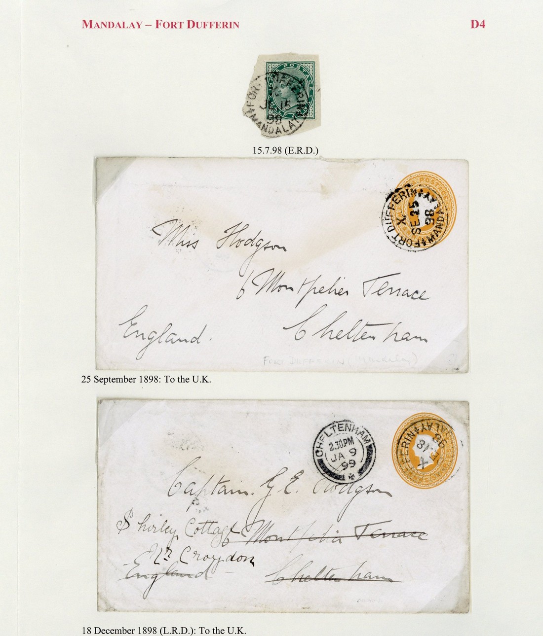 1898 (25 Sept.) and 18 (Dec.) 2½a. stationery envelope from the same correspondence to England, both cancelled by "fort differin/x./mandalay" c.d.s. (Type D3, the latter the latest recorded date); 1904 (2) June ¼a. stationery cards (2, one with corner missing) from same correspondence to Kent, both with local painting on reverse, cancelled by "fort dufferin" c.d.s. (Type D6), showing "T" in circle and "½d/f.b./c" h.s.; and 1905 ¼a. stationery card from India to Mandalay and re-addressed to London, showing Fort Dufferin arrival c.d.s. and showing Mandalay framed "reexpedie" h.s. (Type I11; the only recorded example)