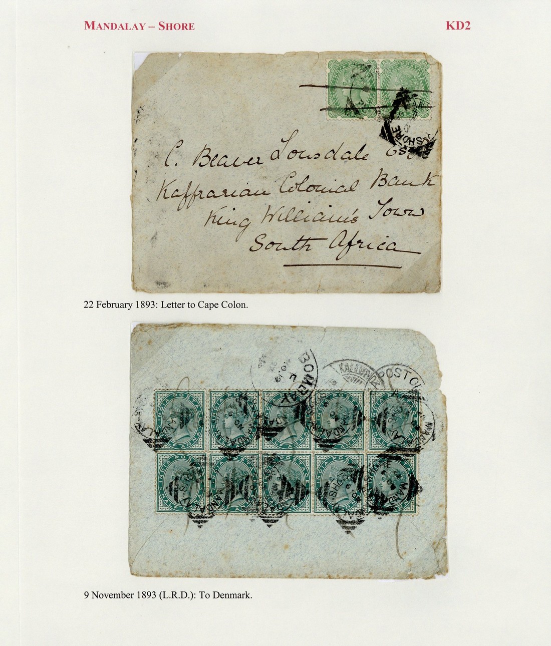 1893 (22 Feb.) envelope to South Africa bearing 2½a. (2) and 1893 (9 Nov.) envelope to Denmark bearing ½a. (10), all cancelled by "mandalay shore" squared-circle d.s. (Type KD2; the latter the latest recorded date) and both covers with faults; and 1906 (15 June) unpaid picture postcard to Rangoon, showing "shore/mandalay" c.d.s. (Type D6; latest recorded date) and, on arrival, "rangoon/dep." (18.6; Type DP12, earliest recorded date)