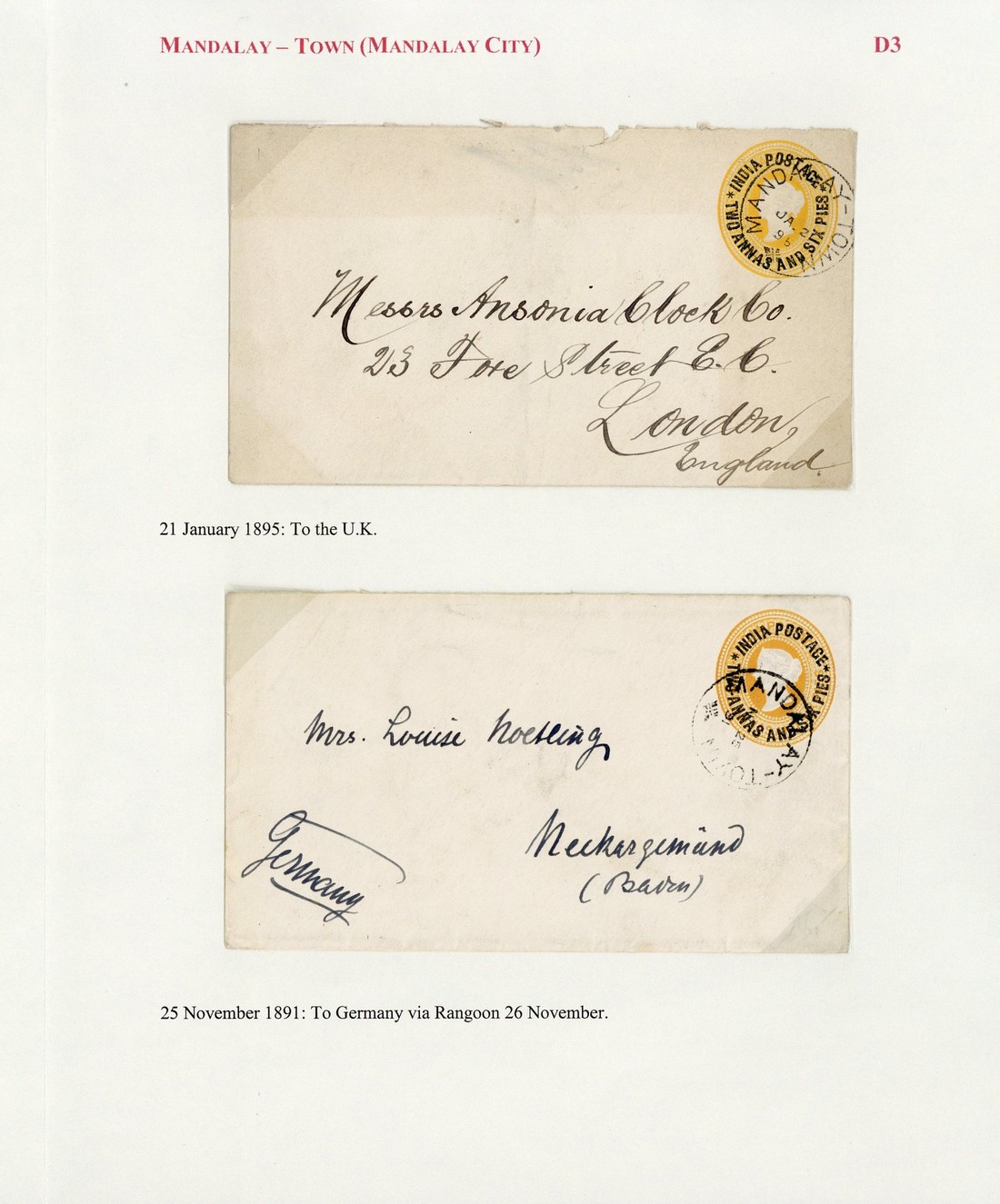 1891 (25 Nov.) and 1895 (21 Jan.) 2½a. stationery envelopes to Germany and London, both cancelled by "mandalay-town" c.d.s. (Type D4; the former the earliest recorded date); 1895 (18 Apr.) OHMS ¼a. stationery card (light stains) addressed locally, cancelled by "mandalay-town" c.d.s. and showing another strike in opposite corner struck a day later (Type D4; latest recorded date); 1894 (9 June) ¼a. stationery card to Shwebo and (13 June) 1a. stationery card to Belgium, both cancelled by "town/mandalay" c.d.s. (Type D5; the former the earliest recorded date)